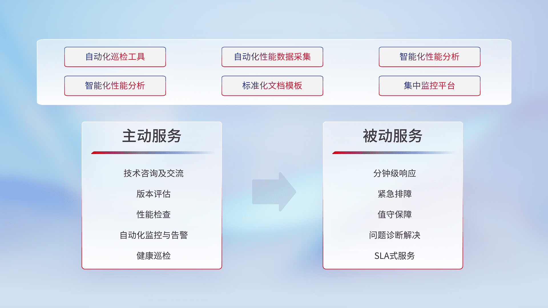 智能化工具和标准化文档,,,保障服务质量,,提供主动服务(包含技术咨询、、、版本评估、、、、性能检查、、自动化监控与告警、、健康巡检)和被动服务包含(分钟级响应、、、、紧急排障、、、值守保障、、、、问题诊断解决、、SLA服务)。。。。