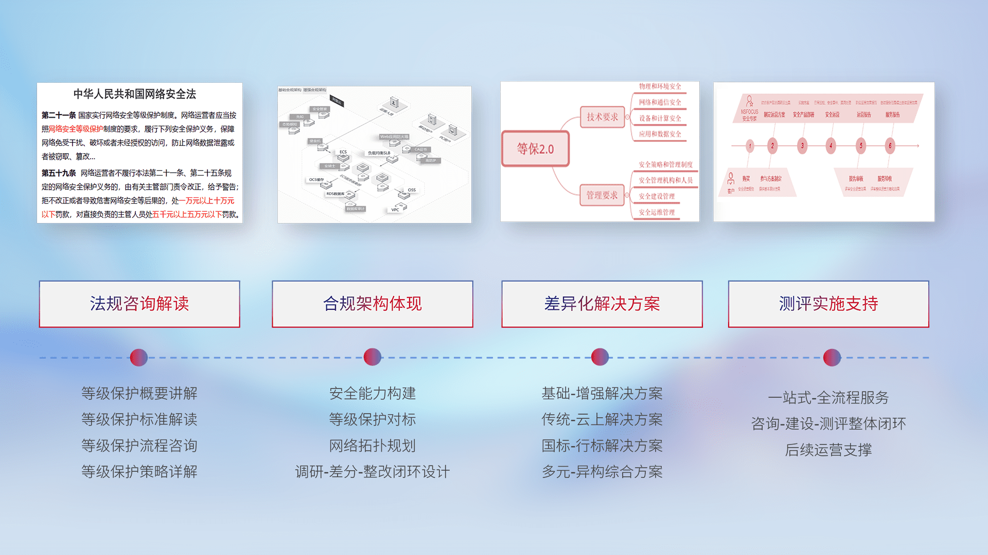 通过专业的法律咨询解读、、合规架构体现、、差异化解决方案、、测试实施支持等服务,,为客户量身打造等保合规体系。。
